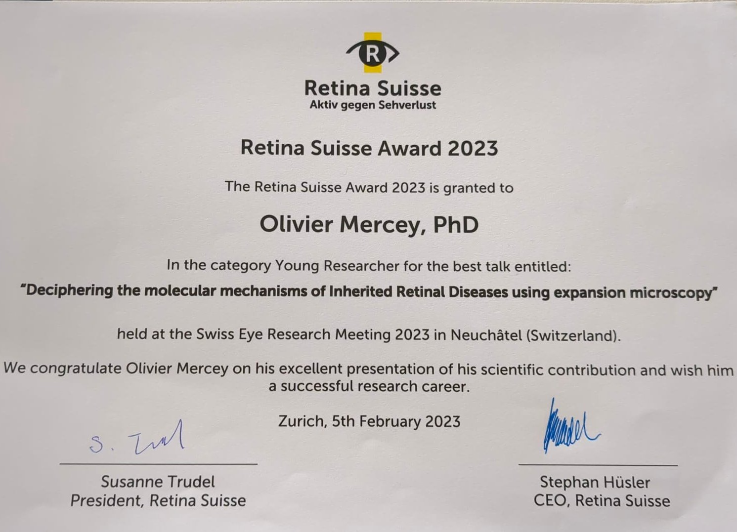 Jan 2023: Olivier got the Best talk Award at the Swiss Eye Research Meeting 2023, Congrats !